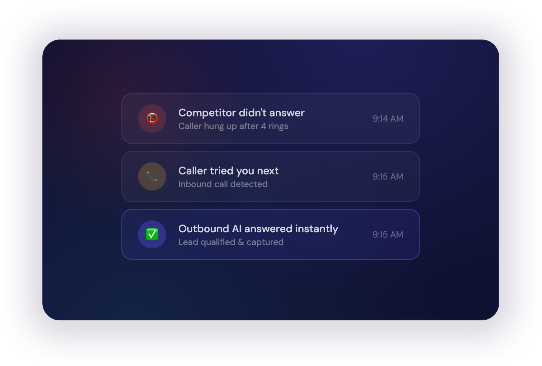 Most callers won’t leave a voicemail — they’ll just call your competitor. Outbound’s AI picks up instantly, sounds professional, and captures every lead before they have a chance to shop around.