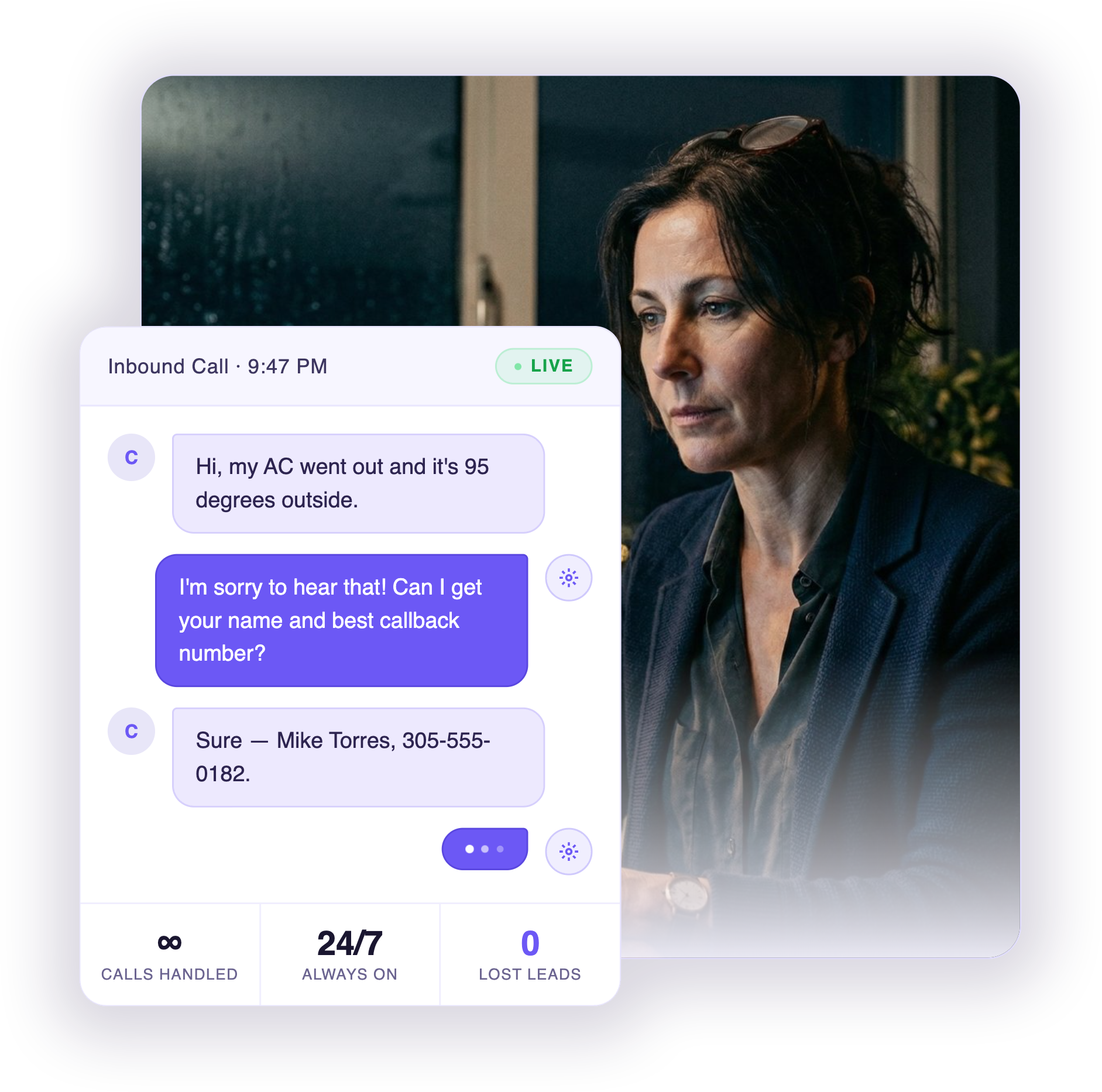 This isn’t a phone tree or a generic bot. Outbound’s AI knows your services, your service area, and your pricing — so it can have a real conversation that helps.