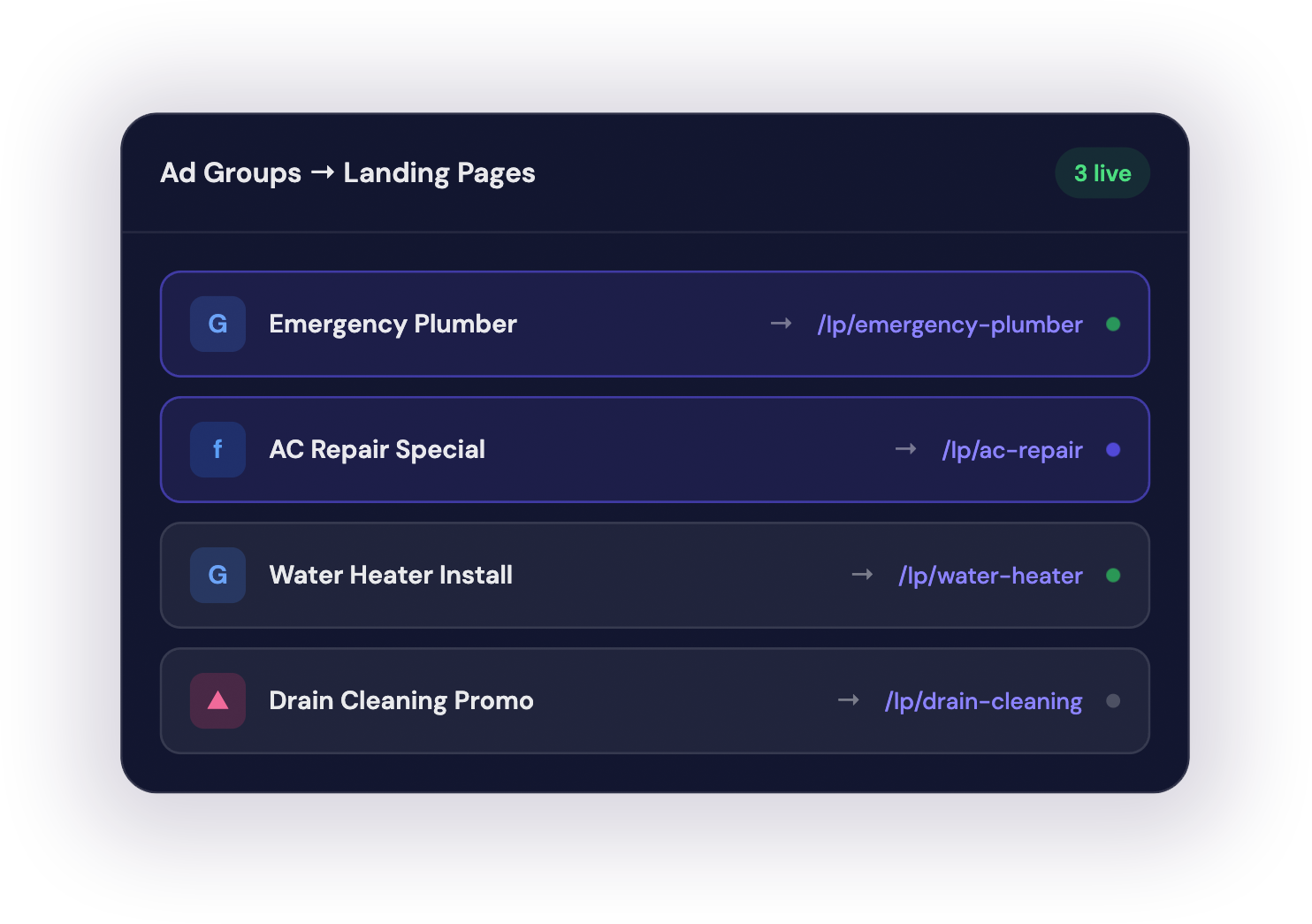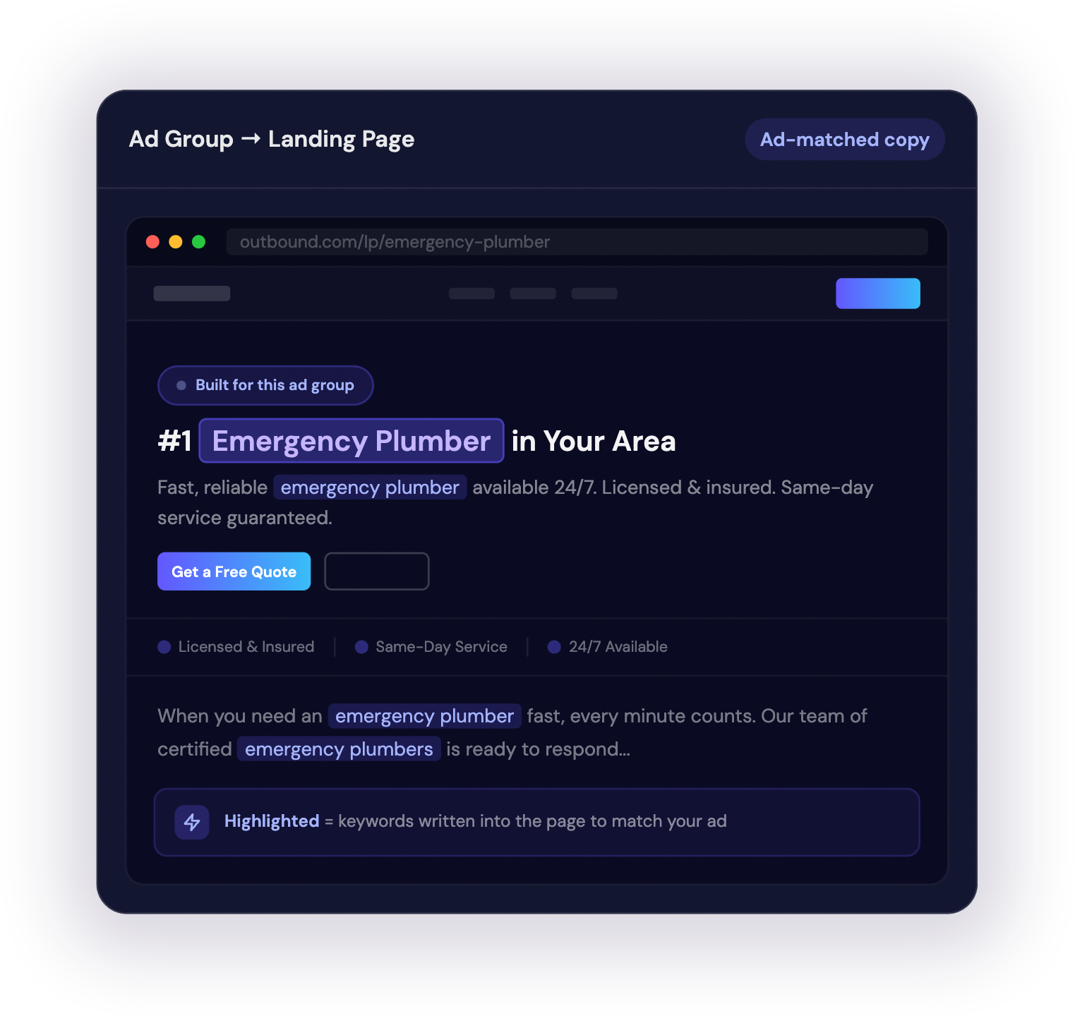 Connect your existing Google Ads account and Outbound automatically generates landing pages from the ads and ad groups you already have. Every page is aligned with the exact message, keywords, and offer someone clicked.