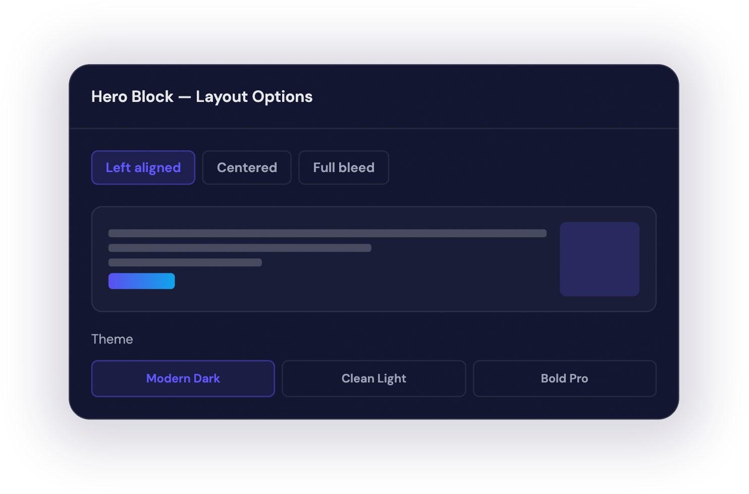 Every page is built from smart blocks curated by human conversion rate optimization specialists. Each block has multiple layout options built in — switch layouts instantly without rebuilding content. Apply themes to control colors, typography, and visual style across the entire page.