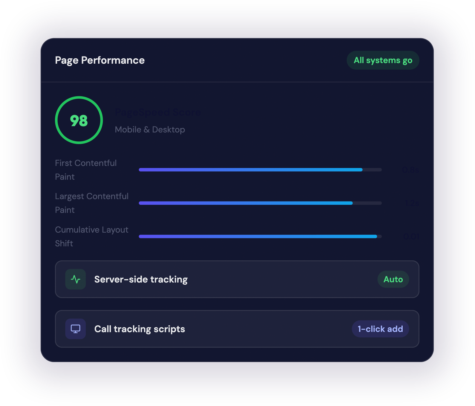 Server-side conversion tracking is configured automatically — so you get more accurate data, better attribution, and protection from browser privacy changes that break traditional tracking. Pages load extremely fast, images are fully optimized, and everything is fully responsive with zero extra design work.