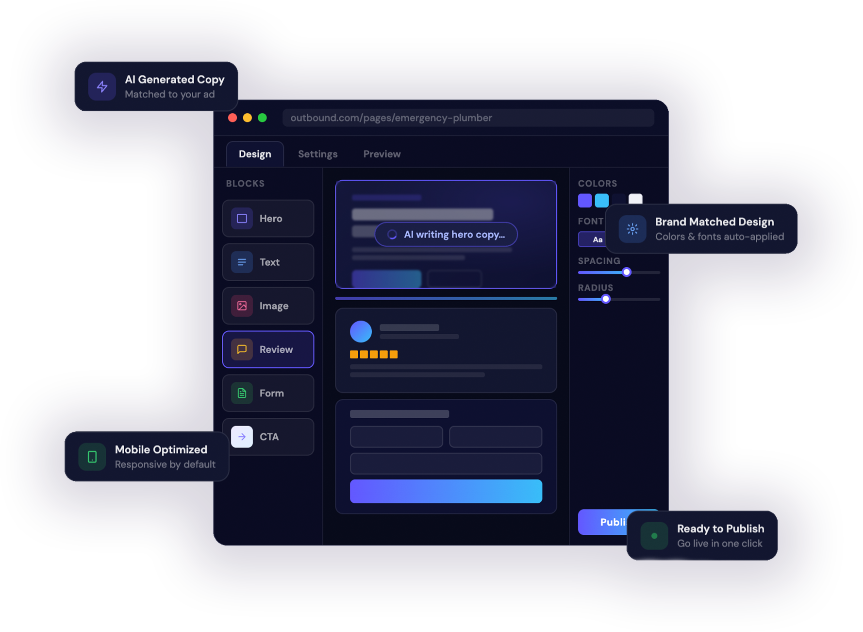 All copy is written for you, and your headlines and ad messaging are injected directly into the page. The same keywords that triggered the ad appear in the landing page headlines — improving relevance and your optimization score on platforms like Google.