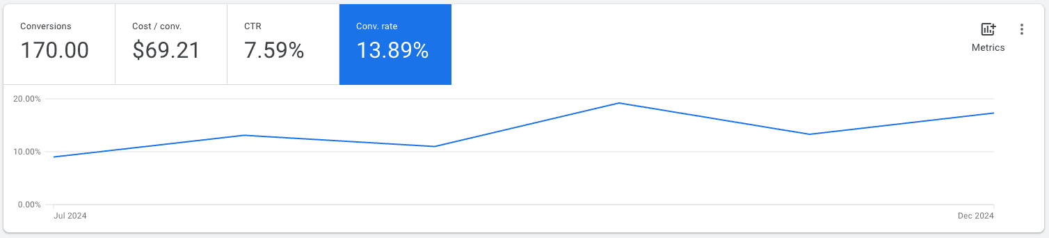 We tested various bidding strategies to explore potential performance improvements using Google’s automated AI bidding. This became a key factor in the account’s overall performance.